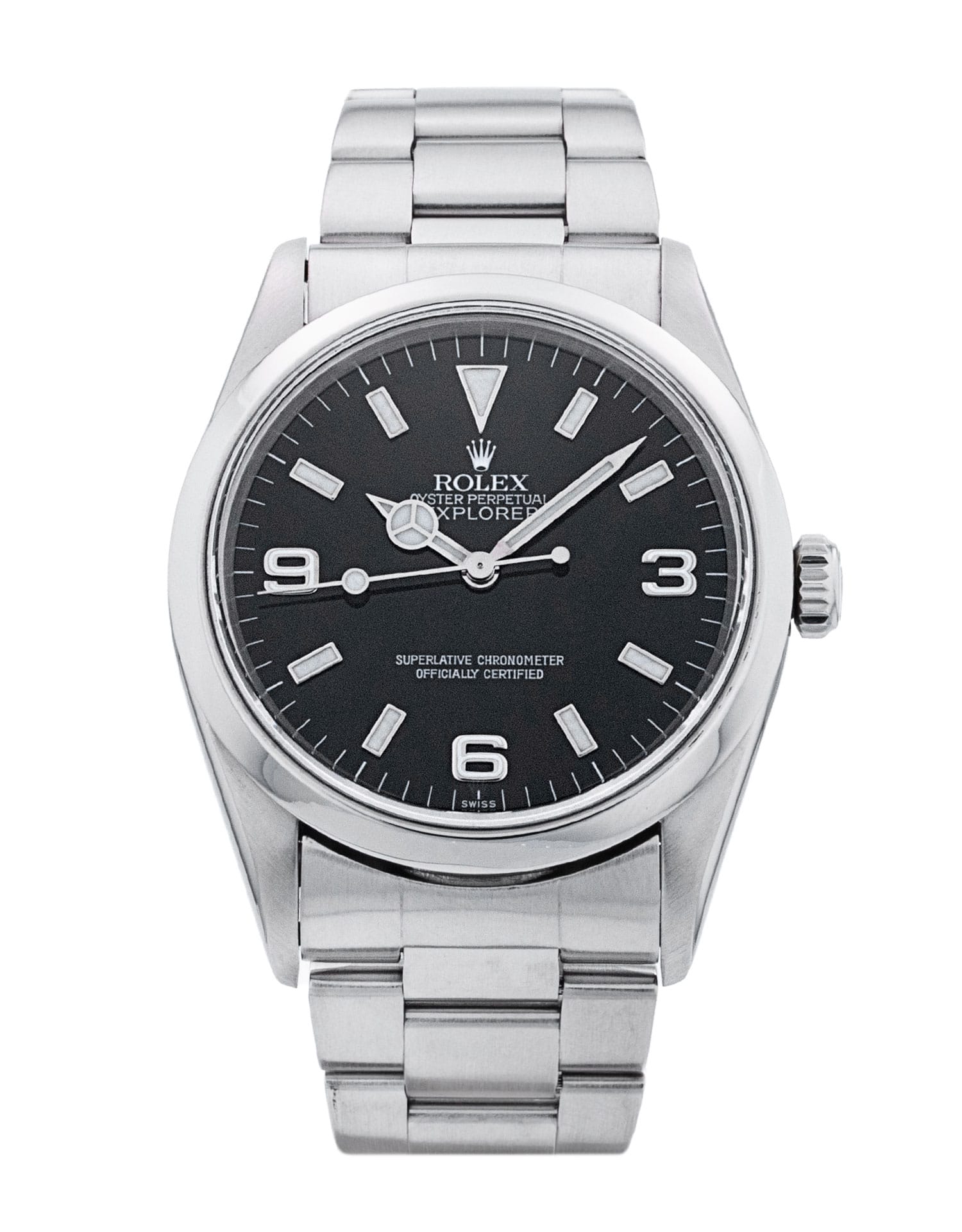 This Rolex Explorer 14270 has a black quarter arabic dial and a bracelet strap. This Rolex has undergone a thorough inspection of water resistance, accuracy, functionality and condition to determine the level of reconditioning required to meet our strict standards. It has also been referenced against technical documents and manufacturer records where available to ensure authenticity and a clean history. All our watches have a 24-month warranty for your peace of mind. One of our skilled polishing technicians has removed marks on the case and bracelet of this watch, brought about by daily wear and tear, which is why this watch does not come with the remaining manufacturer’s warranty.