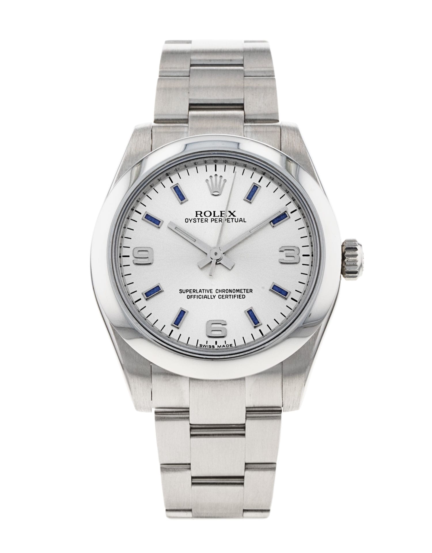 This Rolex Lady Oyster Perpetual 177200 has a silver quarter arabic dial and a bracelet strap. This Rolex has undergone a thorough inspection of water resistance, accuracy, functionality and condition to determine the level of reconditioning required to meet our strict standards. It has also been referenced against technical documents and manufacturer records where available to ensure authenticity and a clean history. All our watches have a 24-month warranty for your peace of mind. One of our skilled polishing technicians has removed marks on the case and bracelet of this watch, brought about by daily wear and tear, which is why this watch does not come with the remaining manufacturer’s warranty.