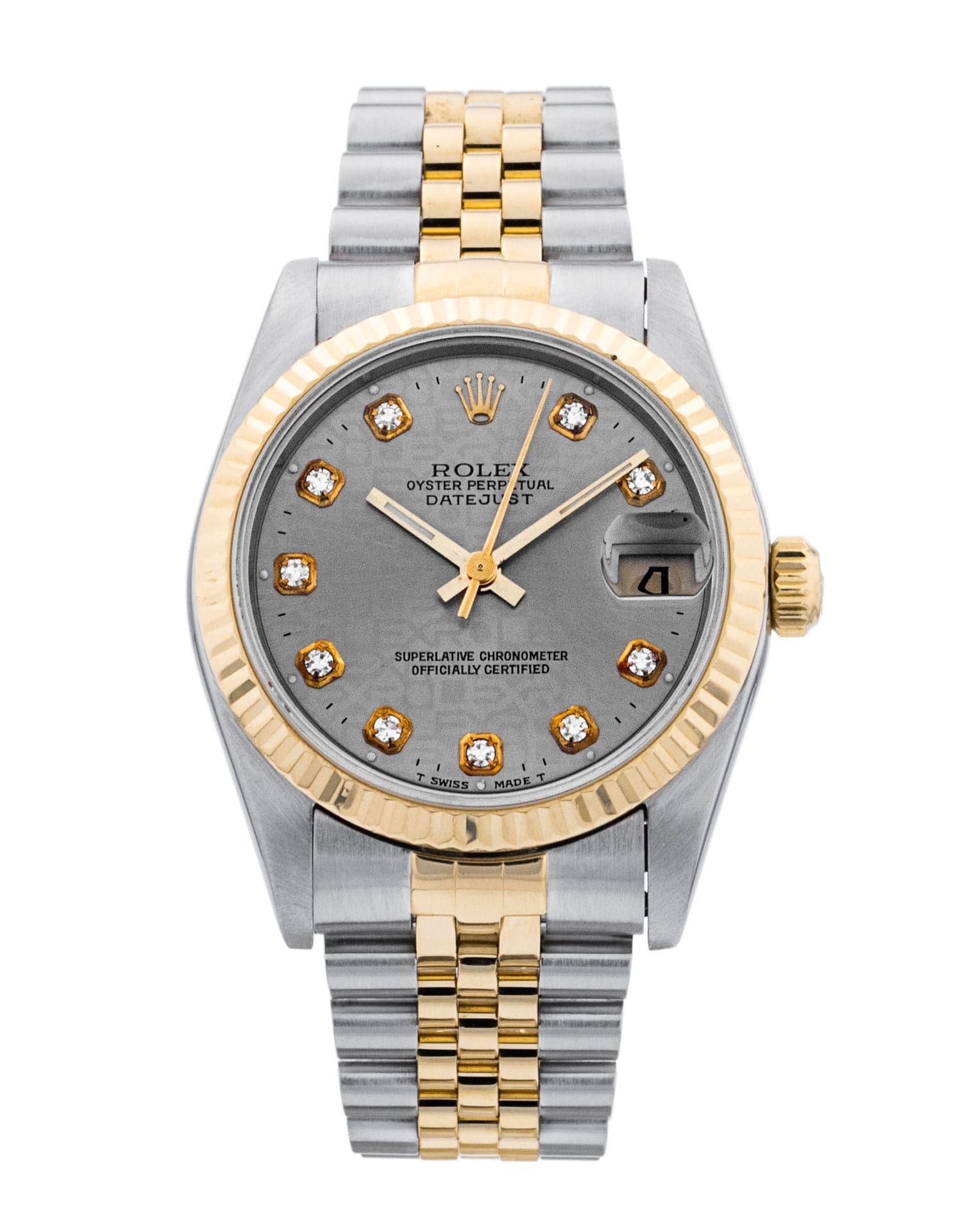 This Rolex Mid-Size Datejust 78273 has a silver jubilee diamond dial and a bracelet strap. This Rolex has undergone a thorough inspection of water resistance, accuracy, functionality and condition to determine the level of reconditioning required to meet our strict standards. It has also been referenced against technical documents and manufacturer records where available to ensure authenticity and a clean history. All our watches have a 24-month warranty for your peace of mind. One of our skilled polishing technicians has removed marks on the case and bracelet of this watch, brought about by daily wear and tear, which is why this watch does not come with the remaining manufacturer’s warranty.