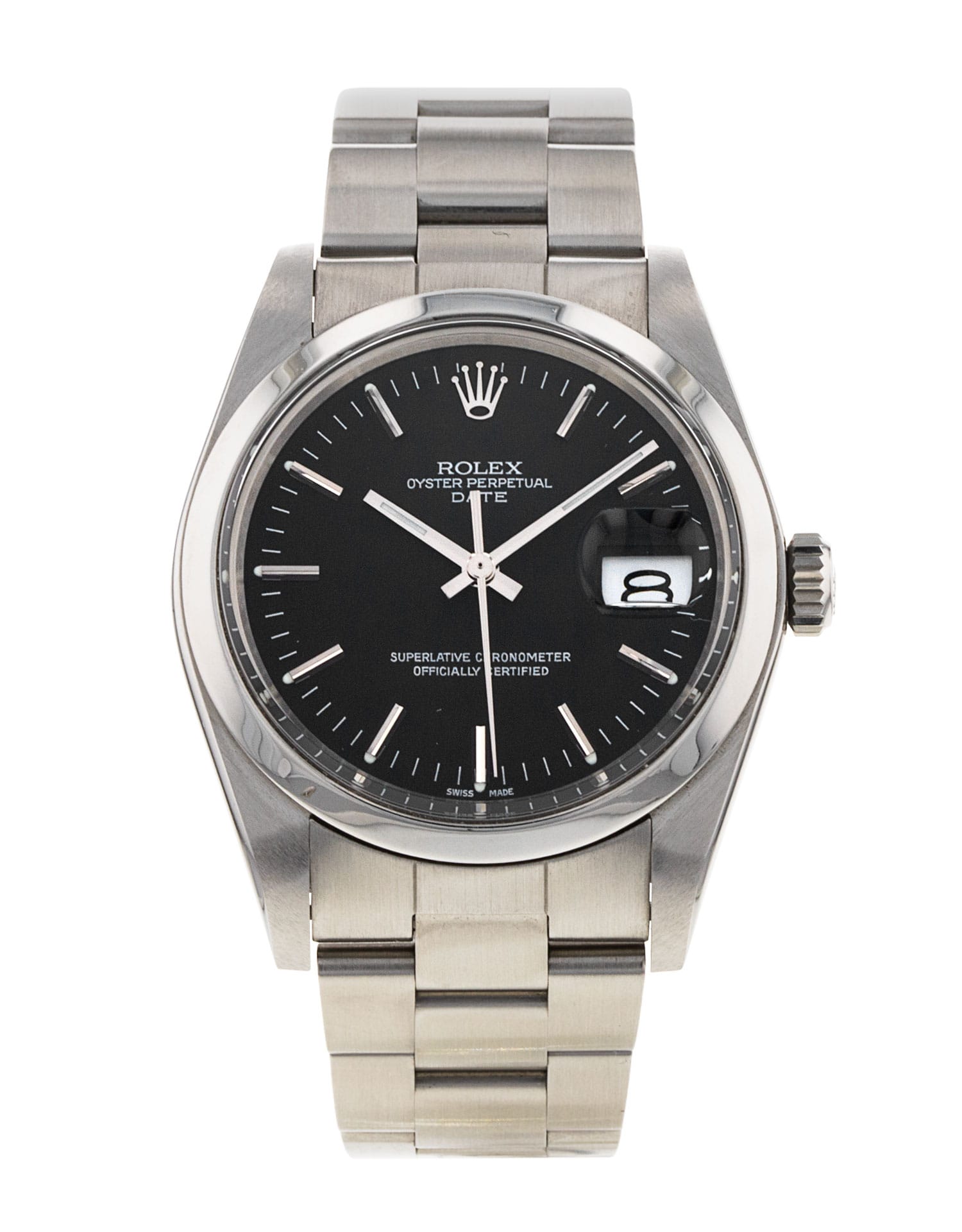 This Rolex Oyster Perpetual Date 1500 has a black baton dial and a bracelet strap. Due to age, this Rolex may not fall within our typical expected tolerances for timekeeping, and is no longer suitable for use in wet environments or submersion in water. In the interests of preserving original features, utmost care has been taken to sympathetically restore this watch. It has also been referenced against technical documents and manufacturer records where available to ensure authenticity and a clean history. One of our skilled polishing technicians has removed marks on the case and bracelet of this watch, brought about by daily wear and tear, which is why this watch does not come with the remaining manufacturer’s warranty.