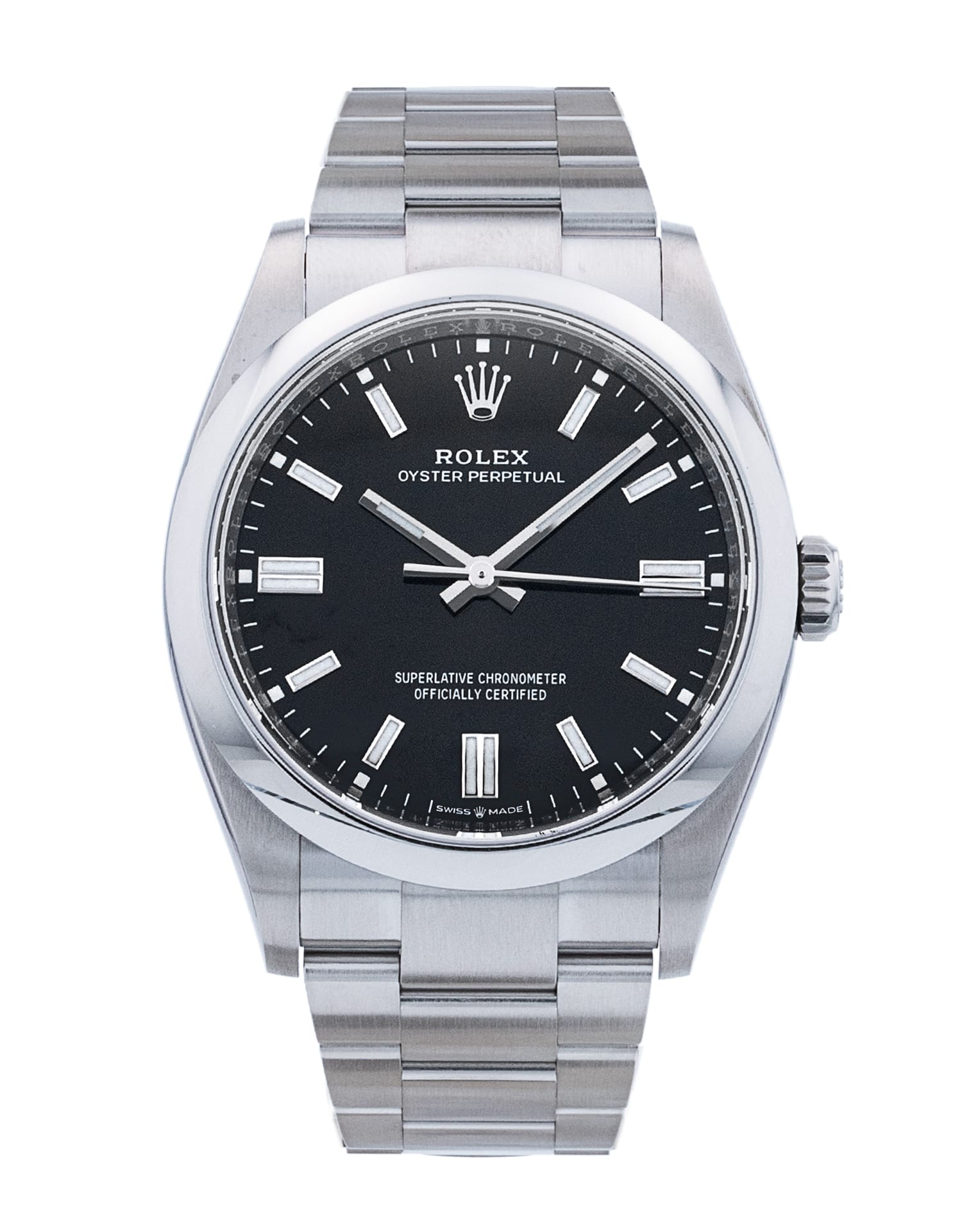 This Rolex Oyster Perpetual 126000 has a black baton dial and a bracelet strap. This Rolex has undergone a thorough inspection of water resistance, accuracy, functionality and condition to determine the level of reconditioning required to meet our strict standards. It has also been referenced against technical documents and manufacturer records where available to ensure authenticity and a clean history. Our watches have a 24-month warranty for your peace of mind, in conjunction with any remaining manufacturer’s warranty from new or from service. To maintain the manufacturer’s warranty on this watch, it has not been polished in our service centre.