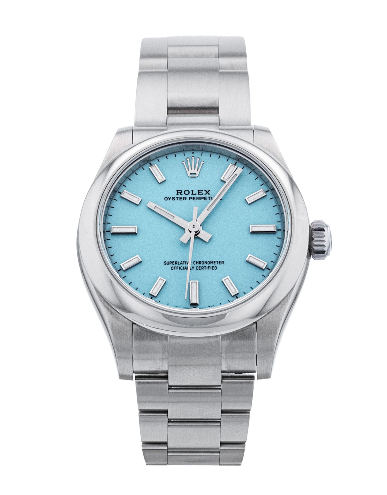 This Rolex Oyster Perpetual 277200 has a turquoise dial and a bracelet strap. This Rolex has undergone a thorough inspection of water resistance, accuracy, functionality and condition to determine the level of reconditioning required to meet our strict standards. It has also been referenced against technical documents and manufacturer records where available to ensure authenticity and a clean history. Our watches have a 24-month warranty for your peace of mind, in conjunction with any remaining manufacturer’s warranty from new or from service. To maintain the manufacturer’s warranty on this watch, it has not been polished in our service centre.