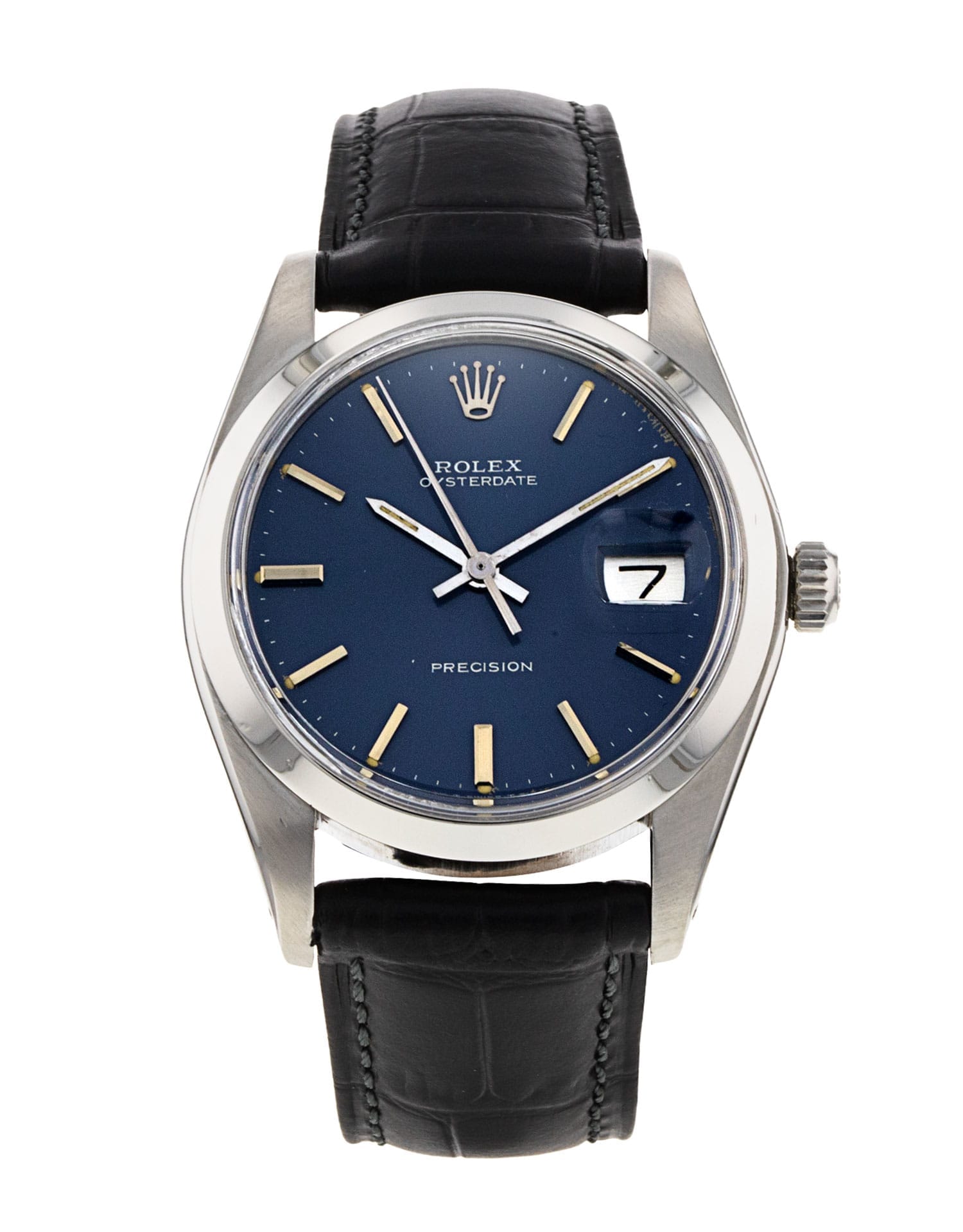 This Rolex Oyster Precision 6694 has a blue baton dial and a leather strap. This Rolex has undergone a thorough inspection of accuracy, functionality and condition to determine the level of reconditioning required to meet our strict standards. It has also been referenced against technical documents and manufacturer records where available to ensure authenticity and a clean history. All our watches have a 24-month warranty for your peace of mind. One of our skilled polishing technicians has removed marks on the case and bracelet of this watch, brought about by daily wear and tear, which is why this watch does not come with the remaining manufacturer’s warranty.