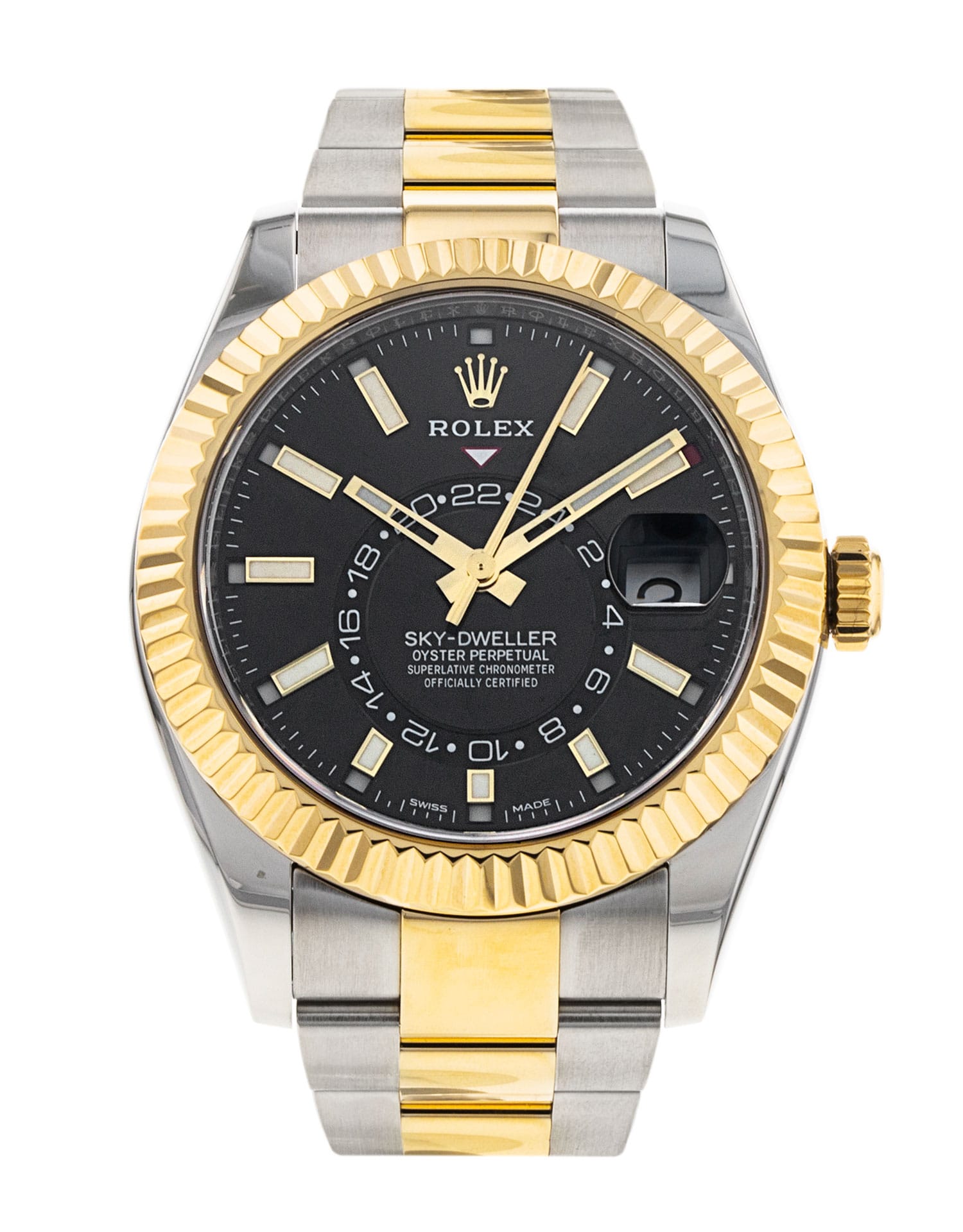 This Rolex Sky-Dweller 336933 has a black dial and a bracelet strap. This Rolex has undergone a thorough inspection of water resistance, accuracy, functionality and condition to determine the level of reconditioning required to meet our strict standards. It has also been referenced against technical documents and manufacturer records where available to ensure authenticity and a clean history. All our watches have a 24-month warranty for your peace of mind. One of our skilled polishing technicians has removed marks on the case and bracelet of this watch, brought about by daily wear and tear, which is why this watch does not come with the remaining manufacturer’s warranty.