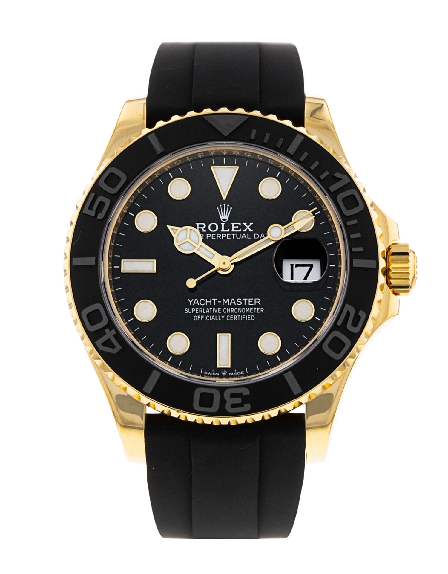 This Rolex Yacht-Master 226658 has a black dial and a rubber strap. This Rolex has undergone a thorough inspection of water resistance, accuracy, functionality and condition to determine the level of reconditioning required to meet our strict standards. It has also been referenced against technical documents and manufacturer records where available to ensure authenticity and a clean history. All our watches have a 24-month warranty for your peace of mind. One of our skilled polishing technicians has removed marks on the case and bracelet of this watch, brought about by daily wear and tear, which is why this watch does not come with the remaining manufacturer’s warranty.