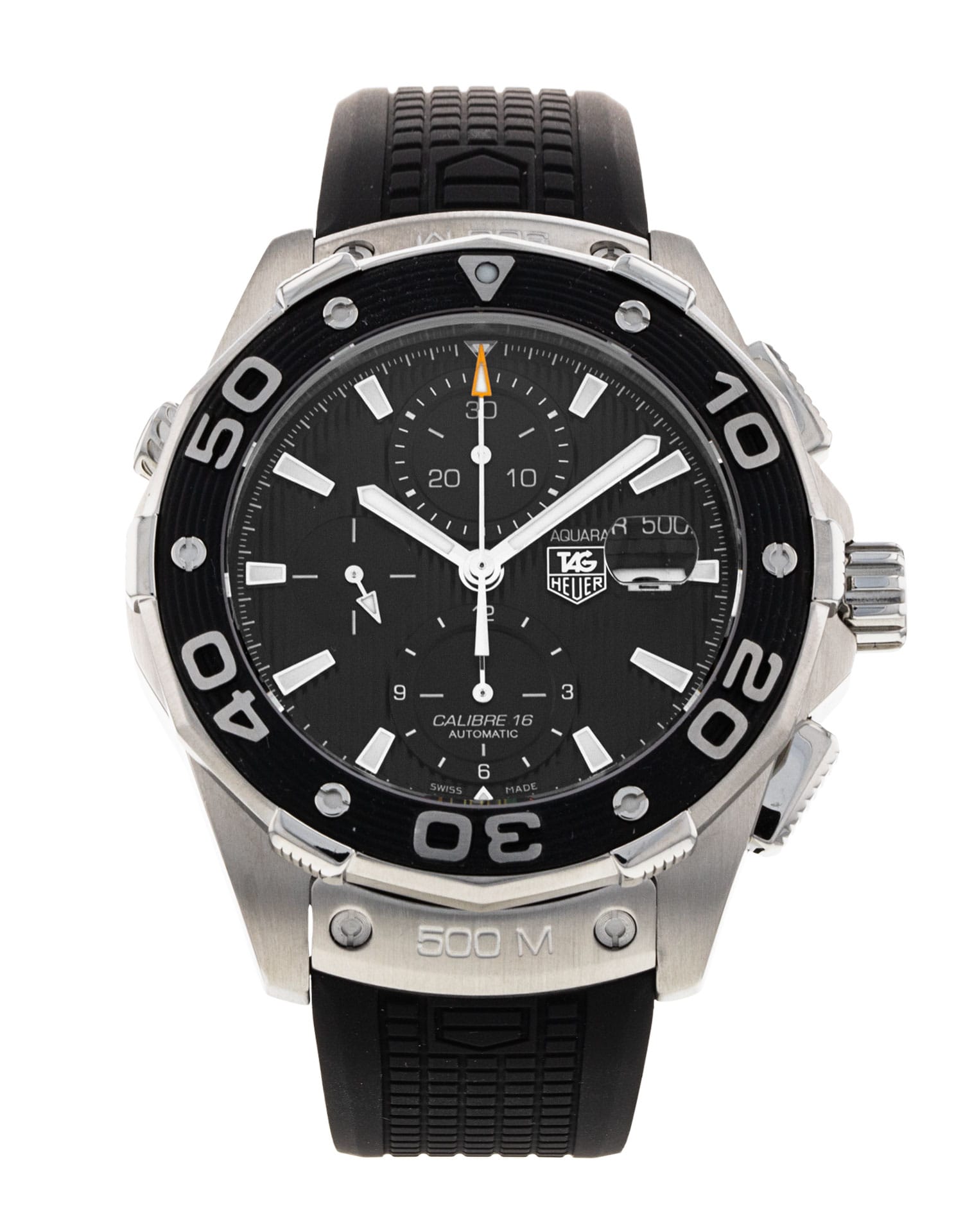 This Tag Heuer Aquaracer CAJ2110.FT6023 has a black baton dial and a rubber strap. This Tag Heuer has undergone a thorough inspection of accuracy, functionality and condition at our Tag Heuer certified service centre to determine the level of reconditioning required to meet our strict standards. It has also been checked against our records to ensure authenticity. All our watches have a 24-month warranty for your peace of mind.