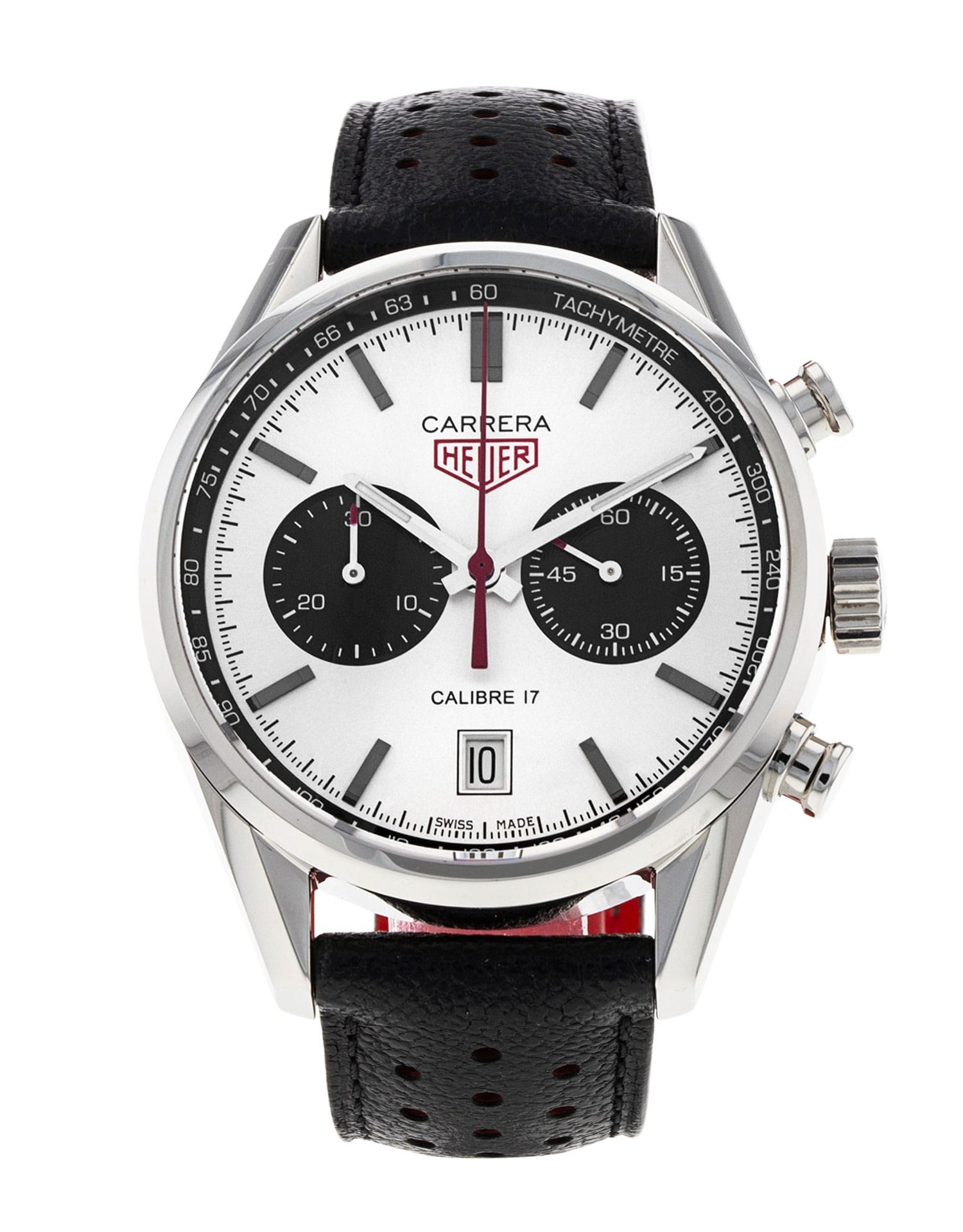 This Tag Heuer Carrera CV211E.FC6310 has a silver baton dial and a leather strap. This Tag Heuer has undergone a thorough inspection of accuracy, functionality and condition at our Tag Heuer certified service centre to determine the level of reconditioning required to meet our strict standards. It has also been checked against our records to ensure authenticity. All our watches have a 24-month warranty for your peace of mind.