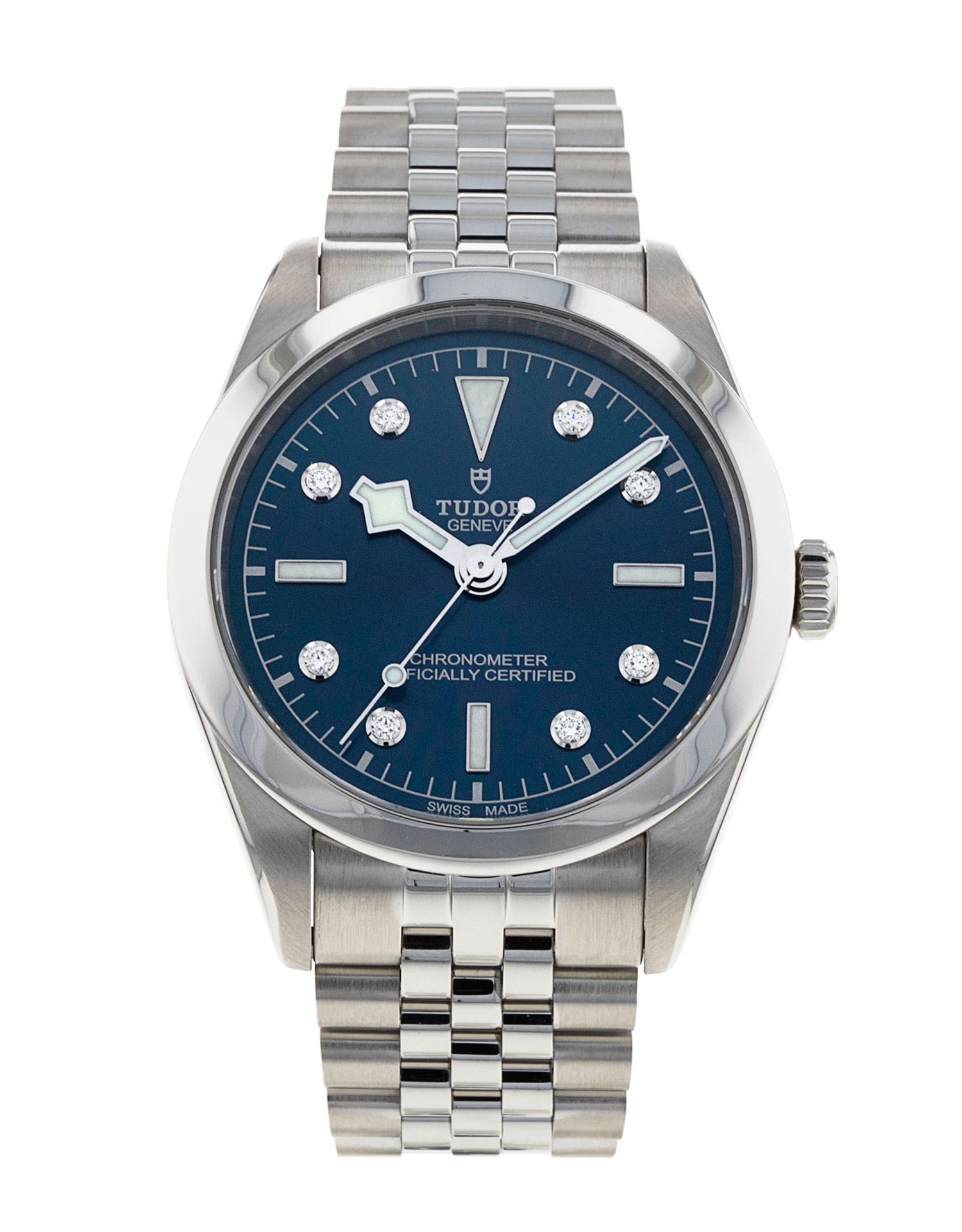 This Tudor Black Bay 36 M79640-0005 has a blue diamond dial and a bracelet strap. This Tudor has undergone a thorough inspection of water resistance, accuracy, functionality and condition to determine the level of reconditioning required to meet our strict standards. It has also been referenced against technical documents and manufacturer records where available to ensure authenticity and a clean history. All our watches have a 24-month warranty for your peace of mind. One of our skilled polishing technicians has removed marks on the case and bracelet of this watch, brought about by daily wear and tear, which is why this watch does not come with the remaining manufacturer’s warranty.