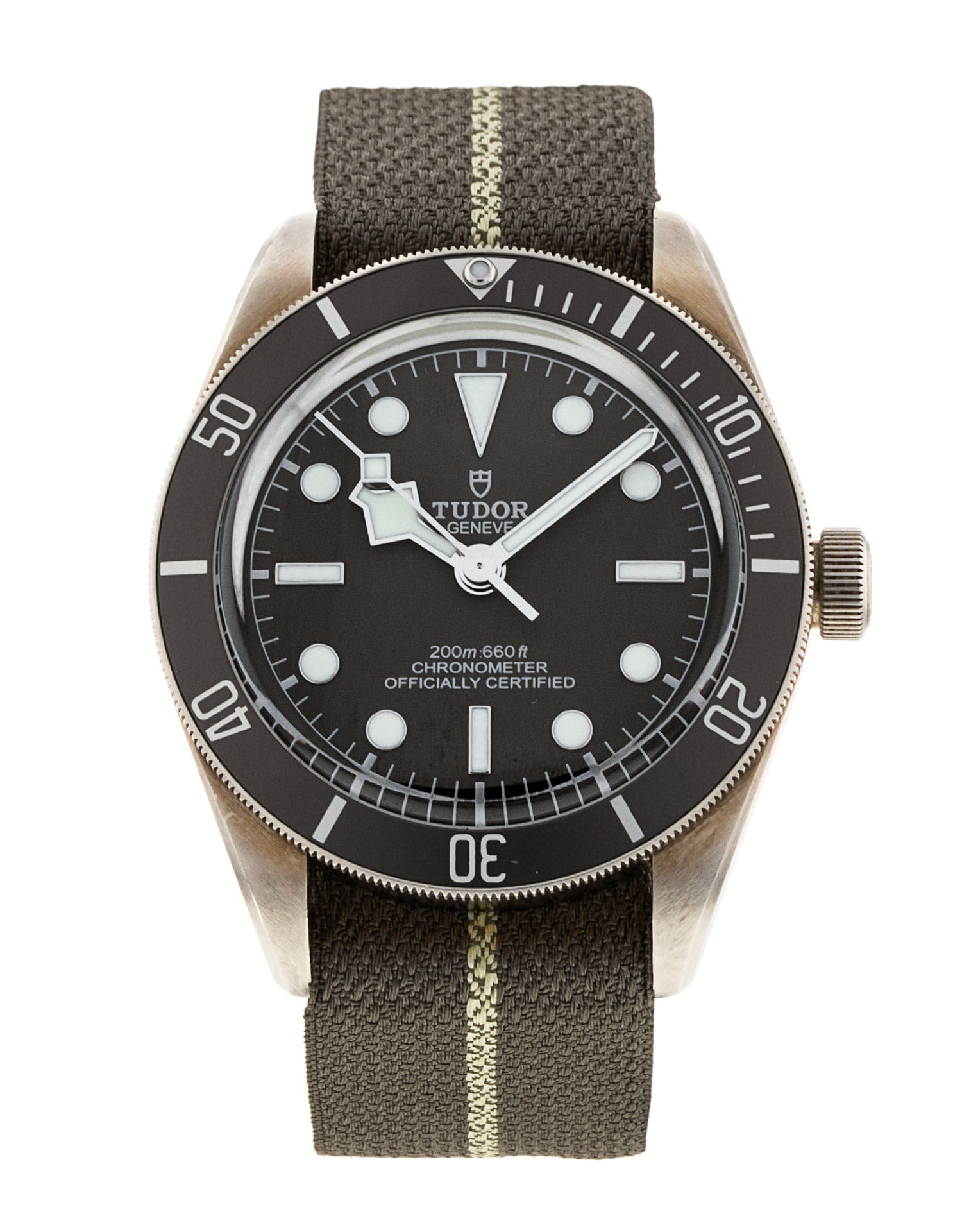 This Tudor Black Bay 58 M79010SG-0002 has a taupe dial and a fabric strap. This Tudor has undergone a thorough inspection of water resistance, accuracy, functionality and condition to determine the level of reconditioning required to meet our strict standards. It has also been referenced against technical documents and manufacturer records where available to ensure authenticity and a clean history. Our watches have a 24-month warranty for your peace of mind, in conjunction with any remaining manufacturer’s warranty from new or from service. To maintain the manufacturer’s warranty on this watch, it has not been polished in our service centre.