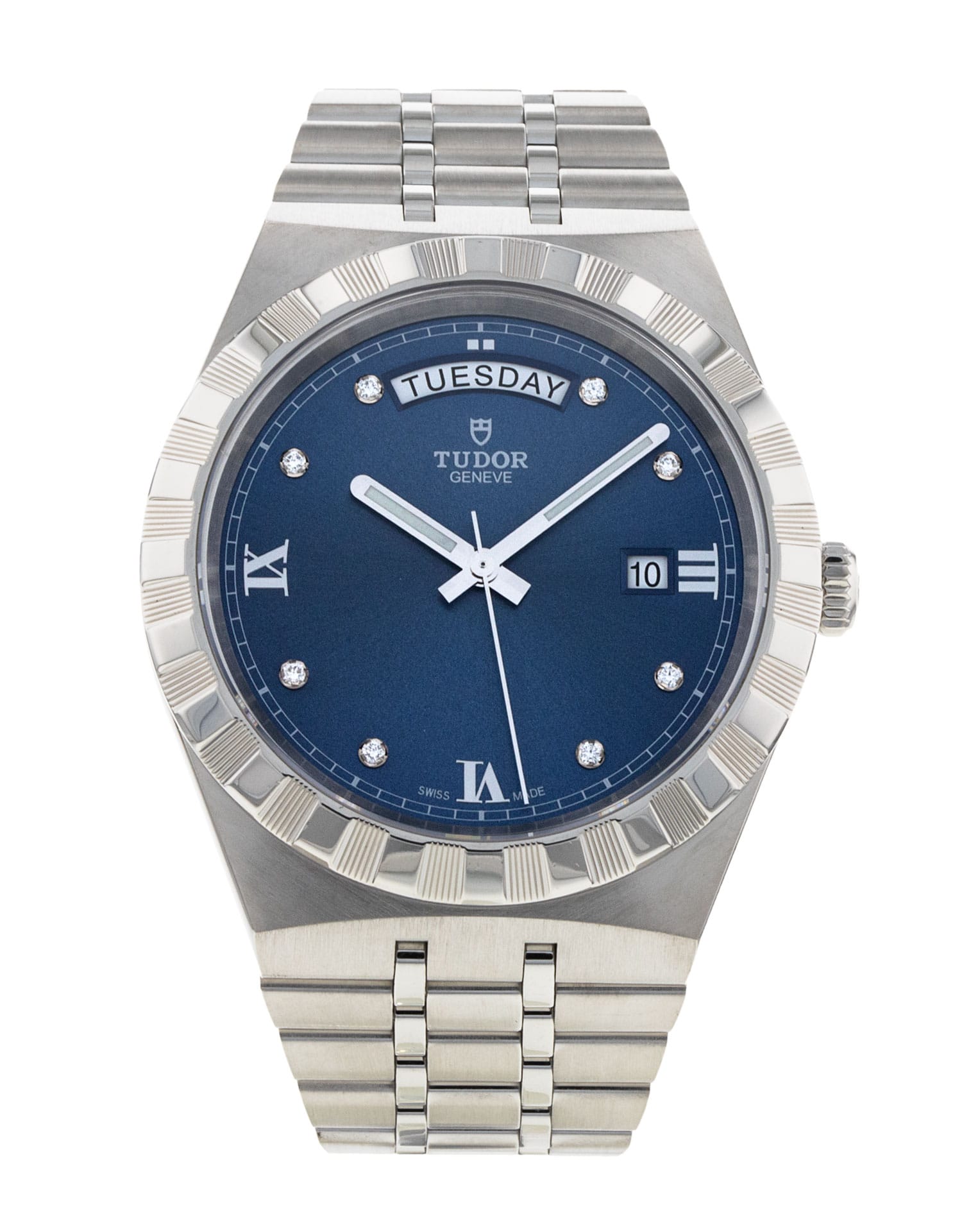 This Tudor Royal M28600-0006 has a blue diamond dial and a bracelet strap. This Tudor has undergone a thorough inspection of water resistance, accuracy, functionality and condition to determine the level of reconditioning required to meet our strict standards. It has also been referenced against technical documents and manufacturer records where available to ensure authenticity and a clean history. All our watches have a 24-month warranty for your peace of mind. One of our skilled polishing technicians has removed marks on the case and bracelet of this watch, brought about by daily wear and tear, which is why this watch does not come with the remaining manufacturer’s warranty.
