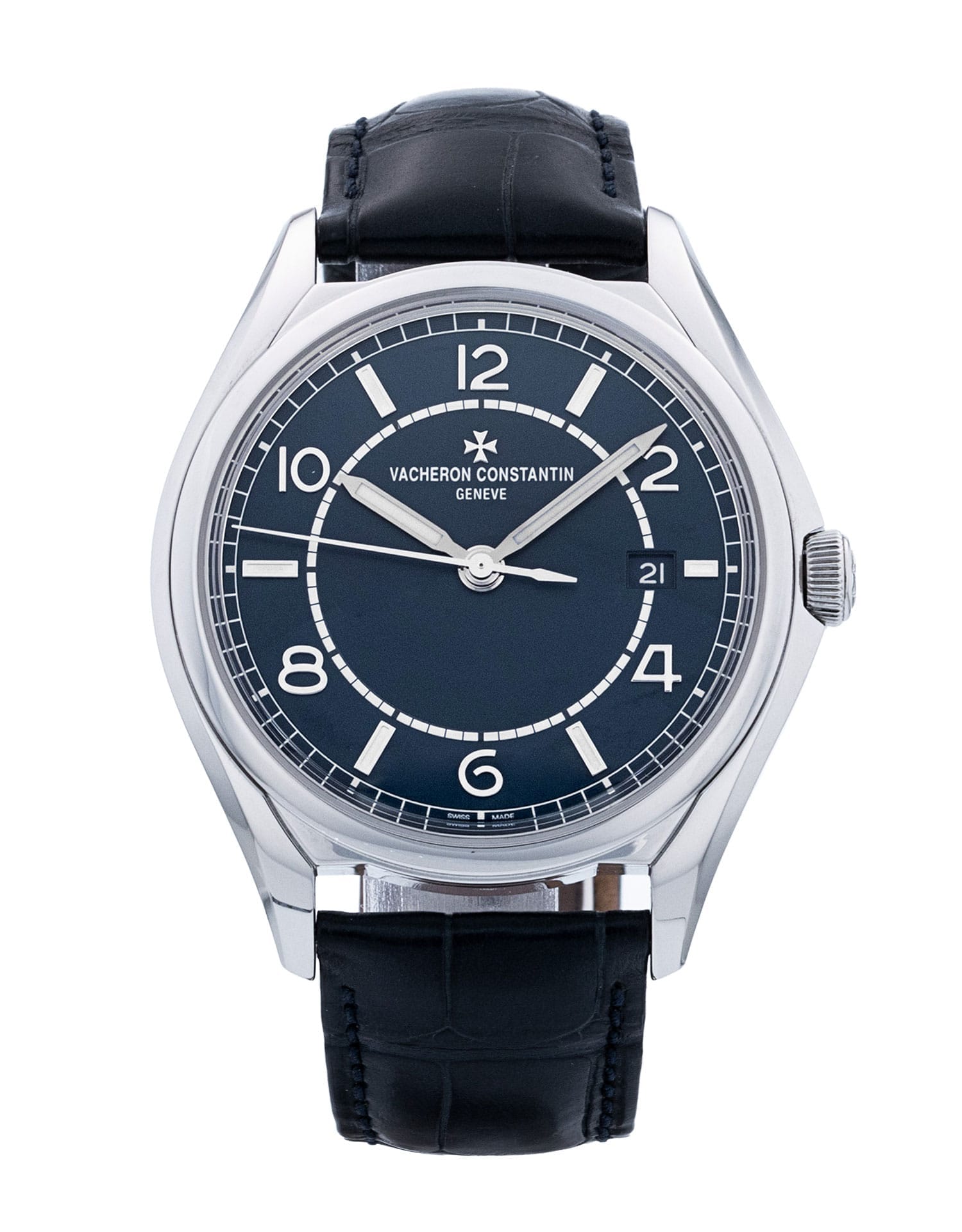 This Vacheron Constantin Fiftysix 4600E/000A-B487 has a blue arabic dial and a leather strap. This Vacheron Constantin has undergone a thorough inspection of accuracy, functionality and condition at our Vacheron Constantin certified service centre to determine the level of reconditioning required to meet our strict standards. It has also been checked against our records to ensure authenticity. All our watches have a 24-month warranty for your peace of mind.
