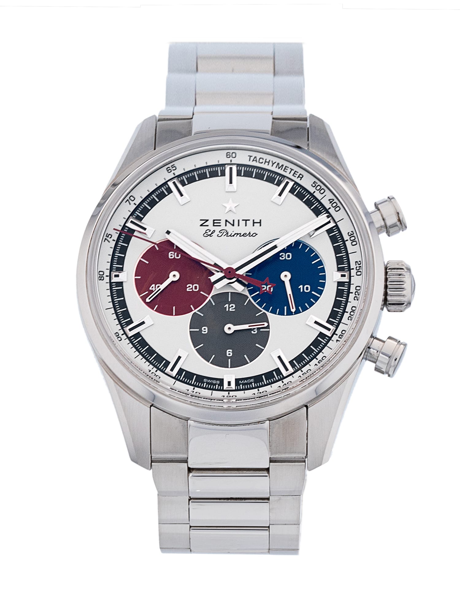 This Zenith Chronomaster 03.2153.4061/04.C844 has a white dial and a bracelet strap. This Zenith has undergone a thorough inspection of water resistance, accuracy, functionality and condition to determine the level of reconditioning required to meet our strict standards. It has also been referenced against technical documents and manufacturer records where available to ensure authenticity and a clean history. All our watches have a 24-month warranty for your peace of mind.