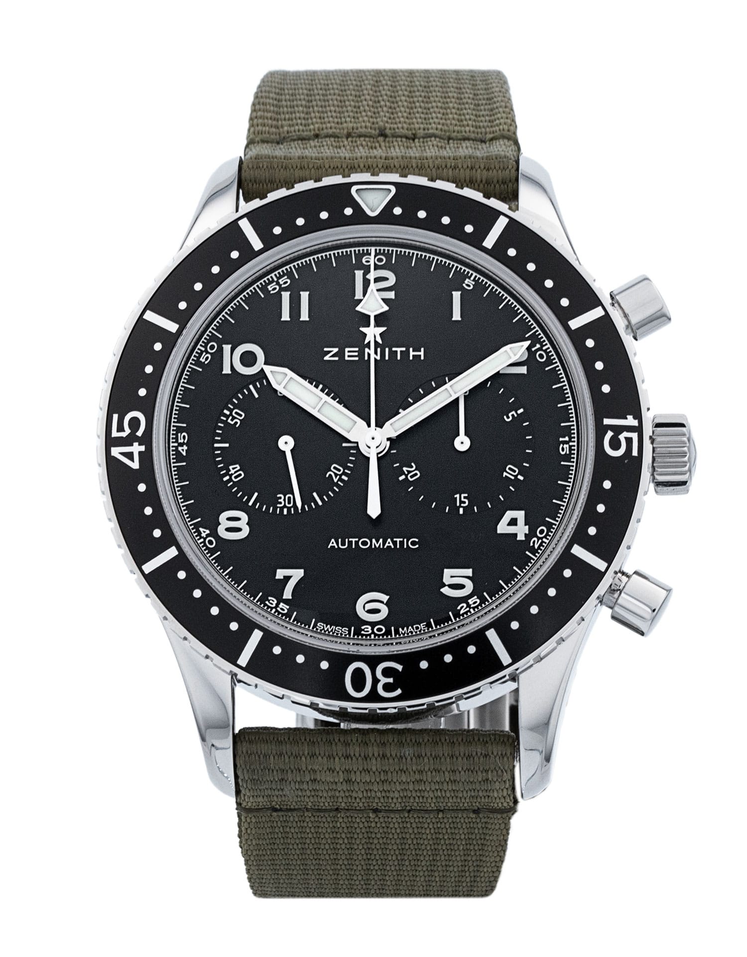 This Zenith Pilot 03.2240.4069/21.C774 has a black arabic dial and a fabric strap. This Zenith has undergone a thorough inspection of water resistance, accuracy, functionality and condition to determine the level of reconditioning required to meet our strict standards. It has also been referenced against technical documents and manufacturer records where available to ensure authenticity and a clean history. All our watches have a 24-month warranty for your peace of mind.
